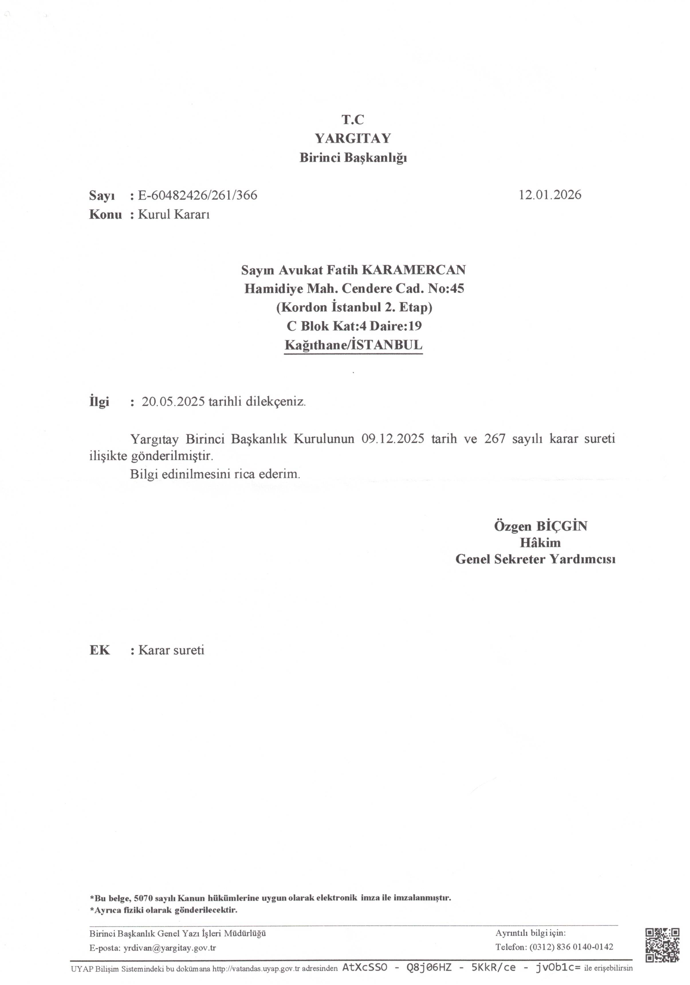Yargıtay Birinci Başkanlık Kurulunun 09.12.2025 tarih ve 267 sayılı karar sureti ilişikte gönderilmiştir.